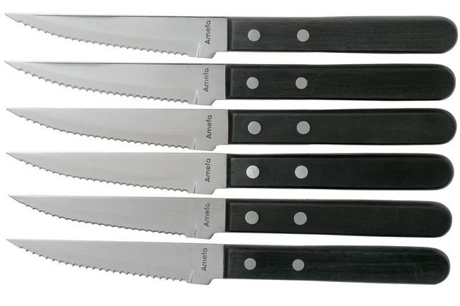 With these Amefa steak knives you can enjoy the most delicious steaks, pizza’s and more. These six steak knives are enhanced with a black handle, making them look very tough and robust. The knives are perfect when enjoying a steak, pizza or BBQ or grill dishes. It is the result of the razor-sharp serrated blade. With it you cut meat instead of tearing it. Due to the serrations the knives are also great when cutting through hard crusts. They also retain their sharpness longer than most knives with a smooth blade.