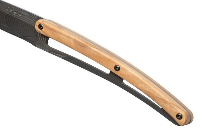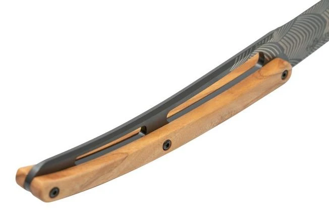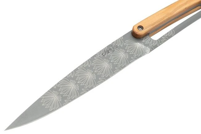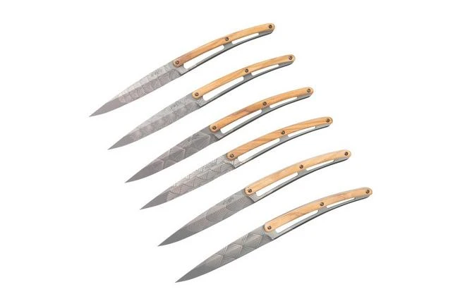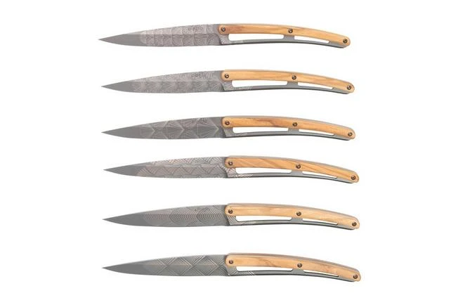 The Deejo Art Deco olive wood 6-piece steak knife set is comprised of six elegant and lightweight steak knives. Each knife only weighs 65 grams. As such the knives are practical and great in use. The blade of the knives is enhanced with an engraving of different geometric patterns. It might remind you of the patterns and figures you see in the Art Deco movement. With these steak knives decorating your dinner table will be a piece of cake.