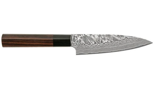 Hand-forged utility knife. A Japanese knife with a blade length of 13.5 cm from the Eden Susumi collection. Eden Kanso Susumi knives are thin and razor-sharp. The SG2 powder steel is stainless and, with a hardness of 62-63 HRC, rock-solid. Next to that the side of the steel is also considerably harder than is common for damascus steel. This means that the side of the knife is much better protected from scratches.
