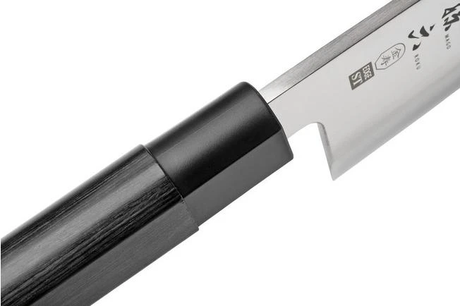 This Deba knife is part of the beautiful Kai Seki Magoroku Kinju collection. The Japanese knife is specially designed for precisely cutting vegetables and fish. It is a fairly large and heavy knife with its wide blade and 16.5 centimetre blade length, but it is still designed in the traditional way. This knife looks magnificent in any kitchen, and is also a joy to work with while cooking. The Deba knife is traditionally used as an axe, since it is a heavy but stable knife. The front part of the blade is best used for filleting, the back part for chopping bones and tendons.