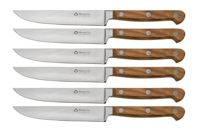 This Maserin Apollo Olive 6-piece steak knife set is a stylish Italian steak knife set with handles made from olive wood. These steak knives are not serrated – they have a flat, razor-sharp edge. This allows them to cut through the meat without tearing it, so the meat stays nice and juicy! These slim, graceful steak knives will be the centrepiece of the dinner table and an excellent way to impress your guests!