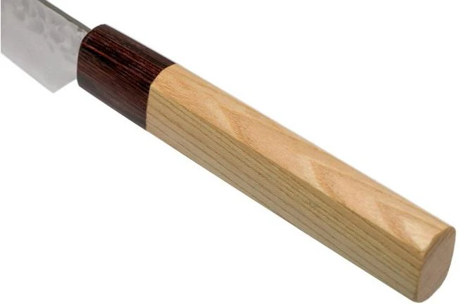 The 13 cm Sakai Takayuki damast Petty steak knife from the 33-layer Vg10 Damascus Hammered WA-collection is a unique and hand-made Japanese kitchen knife. Remarkable about this knife is that it is a fusion of a Petty-knife (a Japanese paring knife) and a steak knife. As a result you can use it as an imposing steak knife during dinner and as a utility kitchen knife for all average-sized cutting jobs.