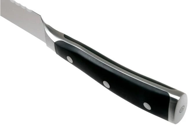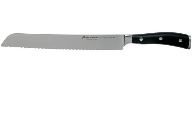The Wüsthof Classic Ikon bread knife, 23 cm has extra small serrations to make sure you can quickly cut through any type of bread without leaving crumbs behind. From hard to soft crusts, from soft buns to baguettes, this knife will quickly cut through it. This all-round knife, however, can also cut through delicious pies or a large piece of celeriac.