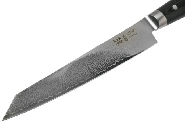 The **Yaxell Ran sujihiki ** is a large and stylish Japanese kitchen knife. This sujihiki is enhanced with a 25 cm long blade with which you can cut through a piece of fish or meat in one go. As such you prevent a sawing movement. This is a real must-have for sushi enthusiasts. Amazing when cutting through maki rolls and to cut sashimi for on nigiri.