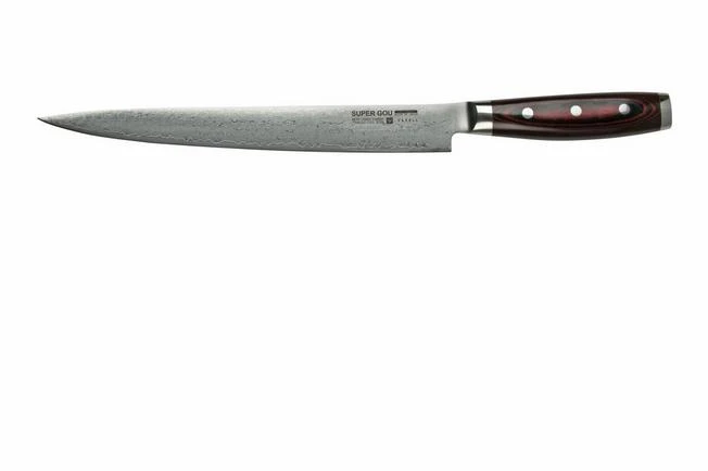 The Yaxell Super Gou Sujihiki is an elongated and razor-sharp knife for cutting sashimi and sushi. Its long blade allows you to cut wafer-thin, straight slices of meat and fish with one smooth movement.